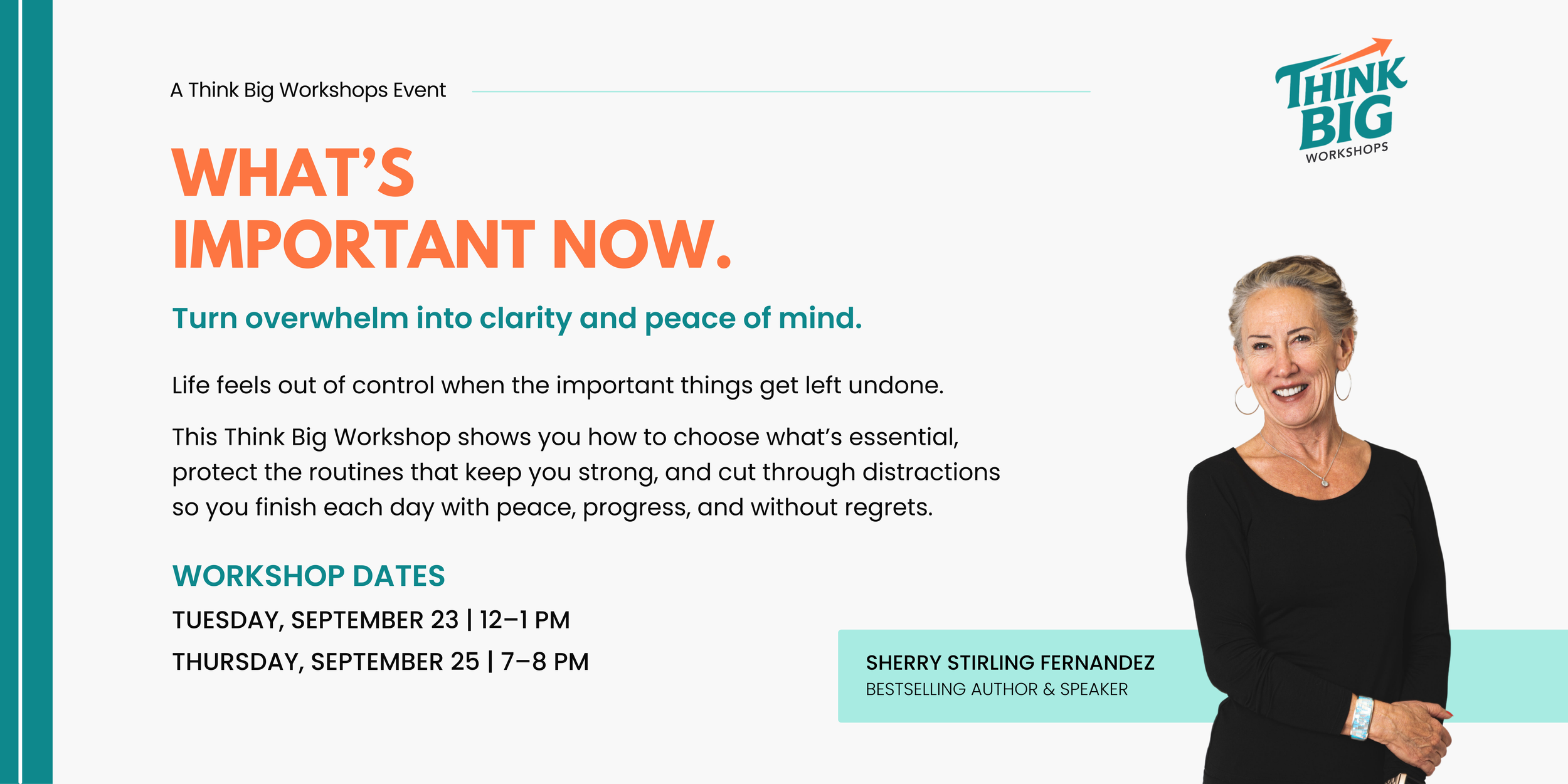 In this Think Big Workshop, bestselling author and speaker Sherry Stirling Fernandez will show you how to focus on what truly matters and let the rest go. She explains why starting with yourself—your health, mindset, and daily habits—creates the strength to guide the rest of your day.
